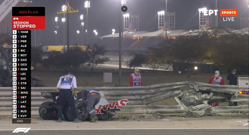 Το μονοθέσιο του Γάλλου τυλίχθηκε αμέσως στις φλόγες, ο αγώνας διακόπηκε χωρίς καθυστέρηση ενώ για αρκετά λεπτά η κατάσταση του R. Grosjean παρέμενε άγνωστη.