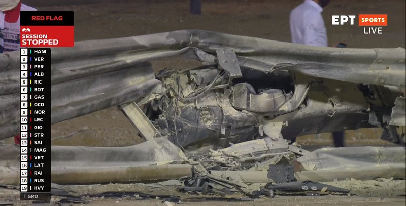 To μονοθέσιο της Haas ήταν κομμένο στα δύο, το μπροστινό τμήμα είχε διαπεράσει τις μπαριέρες και ήταν προφανές ότι τα πράγματα θα είχαν μια πολύ διαφορετική τροπή αν δεν υπήρχε το προστατευτικό halo.