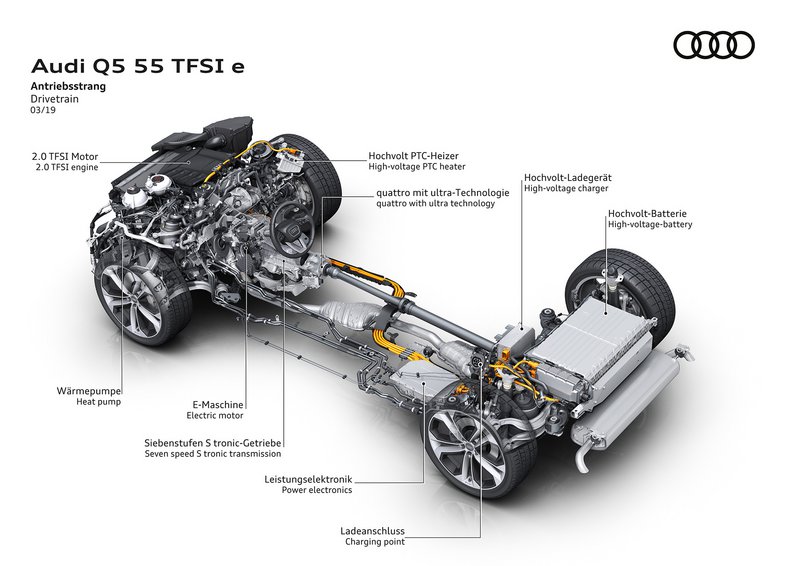 Η Audi συνδυάζει κατά περίπτωση υπερτροφοδοτούμενους κινητήρες άμεσου ψεκασμού (TFSI), είτε τρίλιτρο V6 είτε τετρακύλινδρο δίλιτρο, με έναν ηλεκτροκινητήρα. Σε όλα τα plug-in υβριδικά μοντέλα, ο ηλεκτροκινητήρας είναι ενσωματωμένος στο κιβώτιο ταχυτήτων. Η υβριδική μονάδα αποτελείται από τον ηλεκτροκινητήρα και έναν συμπλέκτη που συνδέει τον κινητήρα TFSI με το σύστημα μετάδοσης κίνησης. Ο συμπλέκτης βρίσκεται ακριβώς μπροστά από το κιβώτιο - τα Q5, A6 και A7 χρησιμοποιούν κιβώτια ταχυτήτων S tronic 7-σχέσεων και τα Q7 και A8 το 8-σχέσεων tiptronic.