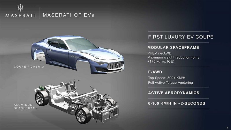 Σχετικά με το 0-100 η Maserati δίνει μία εκτίμηση κάτω από τα 2 sec όταν το κοντέρ θα φλερτάρει με τα 300 km/h. Πέρα από τις κουπέ και κάμπριο Alfieri η Maserati σκοπεύει να αντικαταστήσει την Quattroporte και την Levante, να ανανεώσει την Ghibli και να λανσάρει ένα νέο μεγαλύτερο SUV το 2022.