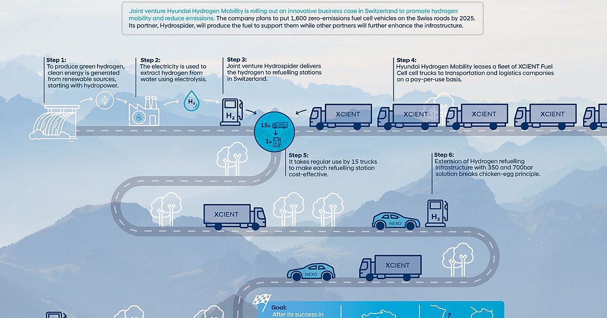 Αναφορικά με το όλο πρόγραμμα, η Hyundai υπέγραψε πέρυσι μία συμφωνία με την ελβετική εταιρία H2 Energy, προσφέροντας με leasing τα εν λόγω φορτηγά. Το μοντέλο ακολουθεί μία λογική pay-per-use, οπότε δεν υπάρχει κάποια επένδυση από τους χρήστες. Σύμφωνα με το πλάνο της φίρμας, το υδρογόνο προέρχεται από υδροηλεκτρικούς σταθμούς και, προφανώς, η χρήση του δεν εκπέμπει ρύπους, παρά μόνο υδρατμούς. Για κάθε 15 φορτηγά οχήματα που κυκλοφορούν, είναι εμπορικά επικερδής η τοποθέτηση μίας αντλίας παροχής καυσίμου. Αρχικά η εταιρία θα ενισχύσει τη θέση της στην Ελβετία, ενώ σε δεύτερο χρόνο θα επεκτείνει το δίκτυό της και σε άλλες χώρες.