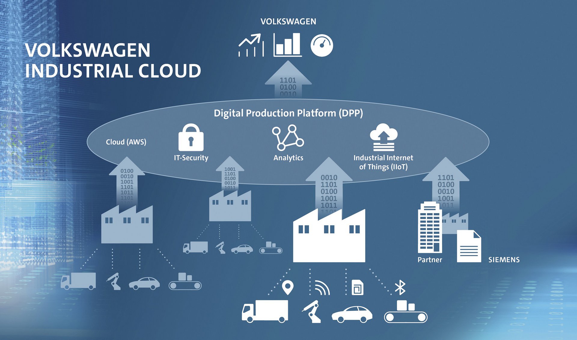 Το «Volkswagen Industrial Cloud», όπως ονομάστηκε, έχει σκοπό να συνδέσει σε ένα κοινό «αποθηκευτικό νέφος» τα μηχανήματα και τις υπηρεσίες των 122 εργοστασίων που διαθέτει ο Όμιλος VAG σε όλο τον κόσμο. Όπως έγινε γνωστό, η Siemens επιλέχθηκε επειδή διαθέτει την τεχνολογία και την τεχνογνωσία για ένα τέτοιο εγχείρημα.
