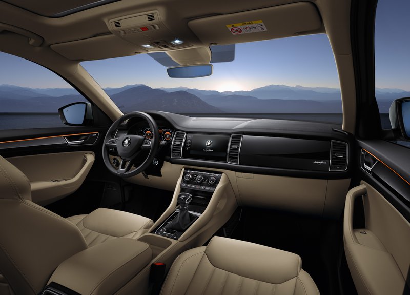 Εννοείται πως τα λογότυπα «Laurin & Klement» κοσμούν και το σαλόνι αυτού του Kodiaq στα καθίσματα και στο ταμπλό. Αξίζει να σημειωθεί ότι αυτό το Kodiaq εξοπλίζεται με ηχοσύστημα της γερμανικής εταιρείας Canton, τα πεντάλ στο χώρο των ποδιών του οδηγού έχουν αλουμινένια καλύμματα, υπάρχει «κρυφός» LED φωτισμός, ενώ το κάθισμα του οδηγού είναι ηλεκτρικά ρυθμιζόμενο.