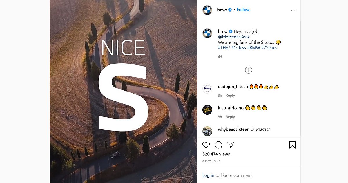 Πιο συγκεκριμένα, επέλεξε το Instagram, ανεβάζοντας ένα βίντεο της Σειράς 7, να κινείται στο επαρχιακό οδικό δίκτυο και πιο συγκεκριμένα σε ένα τεράστιο S του δρόμου. Εκεί κάπου εμφανίζεται το μήνυμα NICE S, ενώ συνεχίζει με πλάνα από λεπτομέρειες της «επτάρας» εν κινήσει. Όπως φαίνεται, η BMW εκτιμά τη δουλειά που έκανε η Mercedes-Benz και δεν δίστασε να το δείξει. Στον πραγματικό κόσμο, βέβαια, η έλευση της νέας S-Class δεν είναι καλό μήνυμα για την εμπορική πορεία της Σειράς 7, Ως εκ τούτου, οι Βαυαροί μηχανικοί και σχεδιαστές έχουν ήδη πιάσει δουλειά, εξελίσσοντας την επόμενη γενιά της, την οποία λογικά θα δούμε το 2022 με 2023.