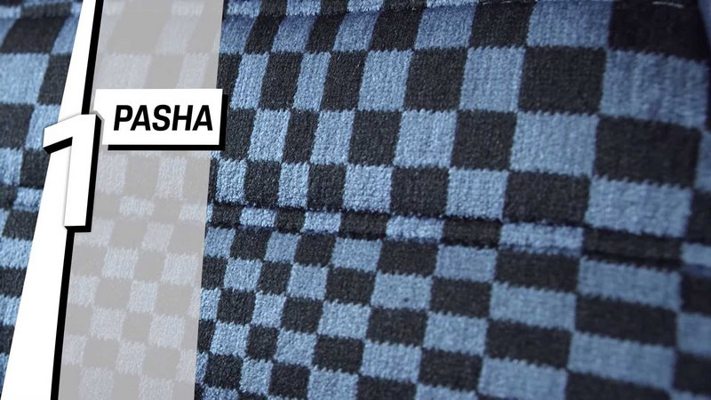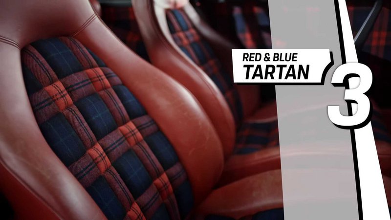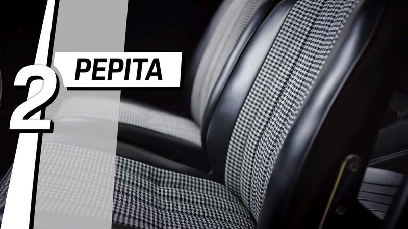 Στην πρώτη θέση τοποθετείται η καρό αγωνιστική επένδυση των καθισμάτων μίας 911 Super Carrera Targa του 1981 με σχεδίαση Pasha όπου το γαλάζιο εναλλάσσεται πολύ όμορφα με το μαύρο δημιουργώντας μία εντυπωσιακά έντονη αντίθεση.