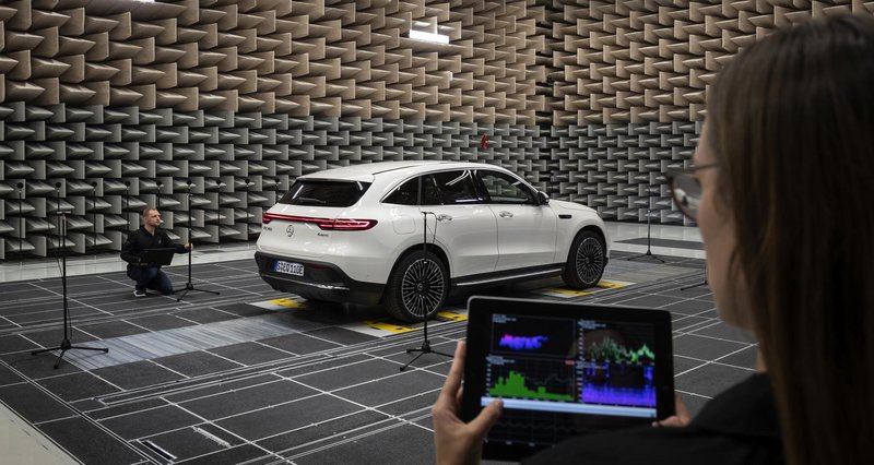 Στην φωτογραφία βλέπετε τους ειδικούς στο Τεχνολογικό Κέντρο της Mercedes-Benz (MTC) στο Sindelfingen να εργάζονται για να δώσουν ήχο στην ηλεκτροκίνητη Mercedes. Τα ειδικά μικρόφωνα στις εξωτερικές εγκαταστάσεις δοκιμών ήχου χρησιμοποιούνται για την ανάπτυξη ενός ειδικά διαμορφωμένου ηλεκτρονικού ήχου για κάθε ηλεκτρικό μοντέλο. Οι προσομοιώσεις, οι μετρήσεις, οι αξιολογήσεις και οι λεπτομερείς βελτιώσεις συνεχίζονται μέχρι το επιθυμητό αποτέλεσμα.