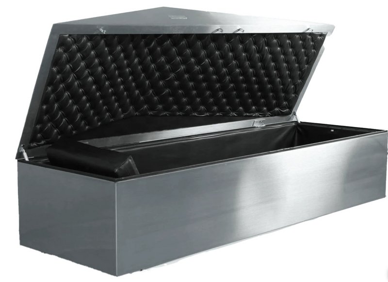 Ένα φέρετρο εμπνευσμένο από το Tesla Cybertruck, για όσους θέλουν να φύγουν από τη ζωή με στιλ... και αεροδυναμική! Το Hypercasket με το φουτουριστικό μεταλλικό φινίρισμα θα έκανε ακόμα και τον Elon Musk να σηκώσει το φρύδι με ενδιαφέρον. Είναι κατασκευασμένο από ανοξείδωτο ατσάλι πάχους 2.053 mm, εξασφαλίζοντας ότι η τελευταία σας «κατοικία» είναι τόσο στιβαρή όσο και εντυπωσιακή.
