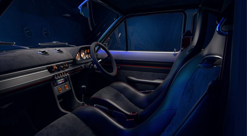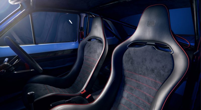 Περνώντας στο εσωτερικό, βρίσκει κανείς μια μίξη από δέρμα κι ύφασμα Alcantara, ζώνες πέντε σημείων, αρκετό ανθρακόνημα κι έναν κλωβό ασφαλείας.