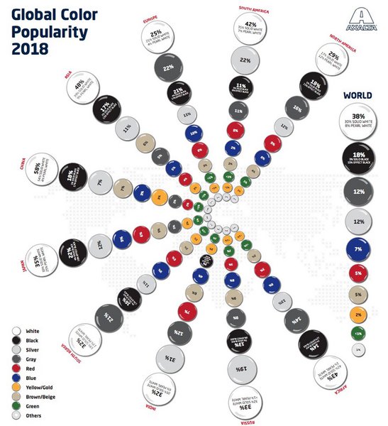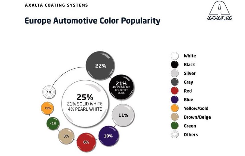Στην Ευρώπη στο λευκό αντιστοιχεί το 25% των νέων αυτοκινήτων για το 2018, στο γκρι το 22% και στο μαύρο το 21%. Ενδιαφέρον έχει πως το λευκό έχει πάνω από 40% στη Νότια Αμερική, στην Ασία και στην Αφρική, ενώ στην Κίνα φτάνει το 58%.