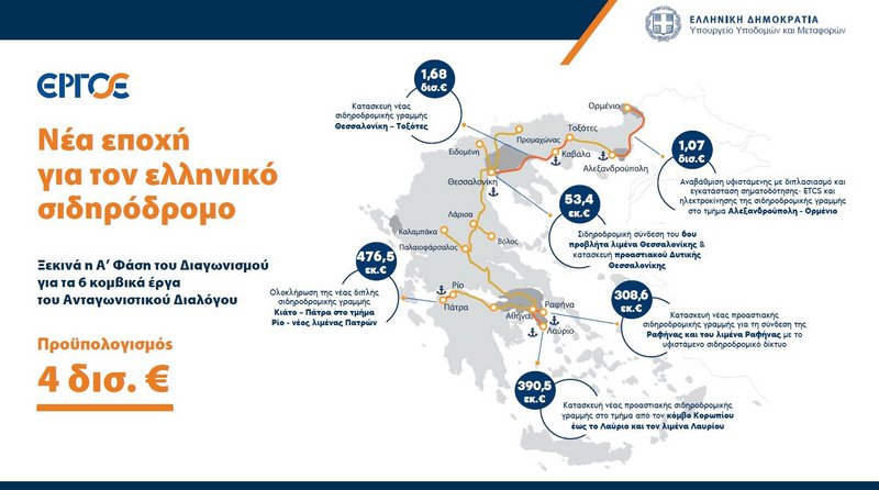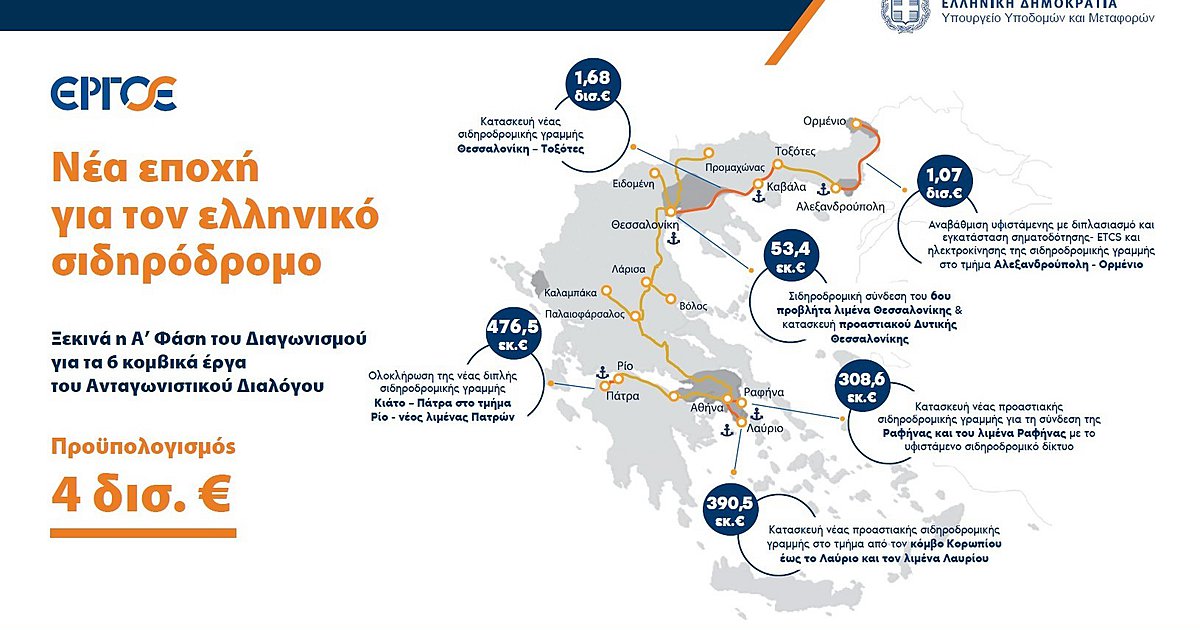 Τη νέα εποχή για τον σιδηρόδρομο σηματοδοτεί η έναρξη του διαγωνισμού για έξι εμβληματικά σιδηροδρομικά έργα συνολικού προϋπολογισμού 4 δισ. € τα οποία υλοποιεί το Υπουργείο Υποδομών και Μεταφορών σε συνεργασία με την ΕΡΓΟΣΕ και πρόκειται να αναβαθμίσουν τον εμπορικό και στρατηγικό ρόλο των βασικών λιμανιών και να αλλάξουν τον χάρτη των μεταφορών.
