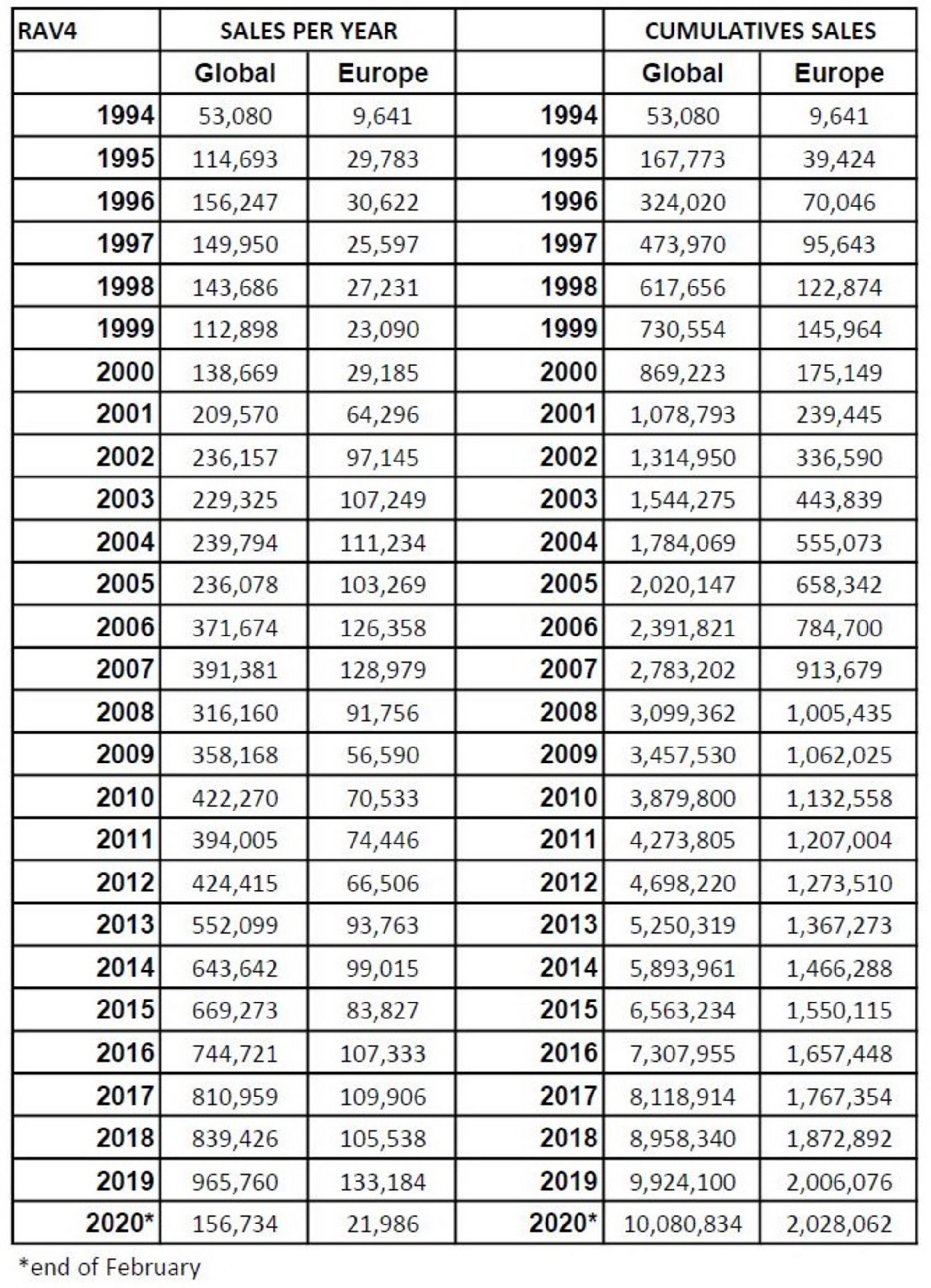 Όπως έγινε γνωστό, από το 1994 μέχρι και τον περασμένο Φεβρουάριο στην Ευρώπη πουλήθηκαν περισσότερα από 2.000.000 οχήματα του μοντέλου. Η Toyota εξακολουθεί να επενδύει στο RAV4 και εντός της χρονιάς θα διαθέσει στην αγορά και την Plug-in Hybrid έκδοσή του. Για λόγους αρχείου, παρακάτω μπορούμε να δούμε αναλυτικά τις πωλήσεις του RAV4 ανά χρονιά, στην Ευρώπη και στο σύνολό τους.