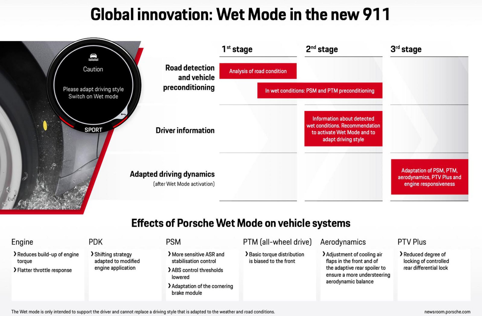 Με την ενεργοποίηση του Wet Mode προσαρμόζονται ανάλογα τα παραπάνω συστήματα, η ροπή και η απόκριση του μοτέρ μειώνεται, το PDK κάνει πιο ήρεμες αλλαγές, το PSM γίνεται πιο ευαίσθητο στην λειτουργία του, στην Carrera S η ροπή περνά κατά κύριο λόγο μπροστά, η αεροδυναμική αλλάζει για περιορισμό μιας πιθανής υπερστροφής κ.α. Αναλυτικότερα παρακολουθείστε το παρακάτω βίντεο.