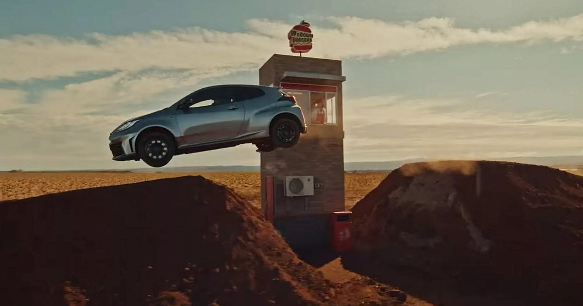 Στη διαφήμιση, το GR Yaris εμφανίζεται σε ένα απομονωμένο τοπίο της αυστραλιανής ενδοχώρας. Ο οδηγός, με αγωνιστικό κράνος και φόρμα, σταματά σε ένα εστιατόριο για να παραγγείλει φαγητό. Όσο η παραγγελία ετοιμάζεται, το αυτοκίνητο κινείται με έντονο ρυθμό σε χωμάτινους δρόμους, πριν ο οδηγός παραλάβει το πακέτο, εκτελώντας ένα εντυπωσιακό άλμα.