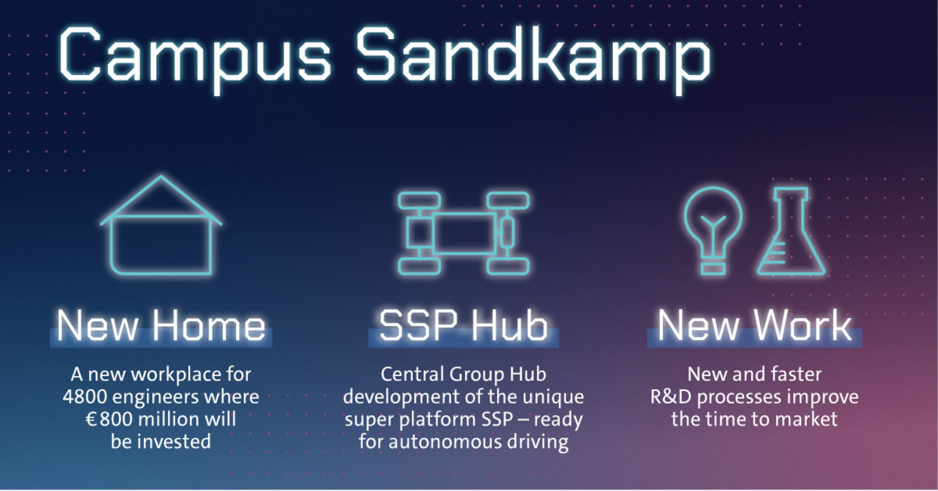 Η Volkswagen σκοπεύει επίσης να θέσει νέα πρότυπα και στην κατασκευαστική διαδικασία του Trinity, όταν ξεκινήσει το 2026, στοχεύοντας σε χρόνο παραγωγής 10 ωρών ανά όχημα. Κλειδί για αυτό θα είναι οι λιγότερες εκδόσεις, ο μικρότερος αριθμός εξαρτημάτων, το μεγαλύτερο ποσοστό αυτοματισμού, οι πιο λιτές γραμμές παραγωγής καθώς και νέες διαδικασίες logistics. Σε αυτό θα συμβάλει και το υπό ίδρυση Campus Sandkamp, το πλέον προηγμένο κέντρο έρευνας και ανάπτυξης του είδους του στην Ευρώπη, το οποίο αποτελεί ξεχωριστή επένδυση της Volkswagen ύψους 800 εκατομμυρίων ευρώ.
