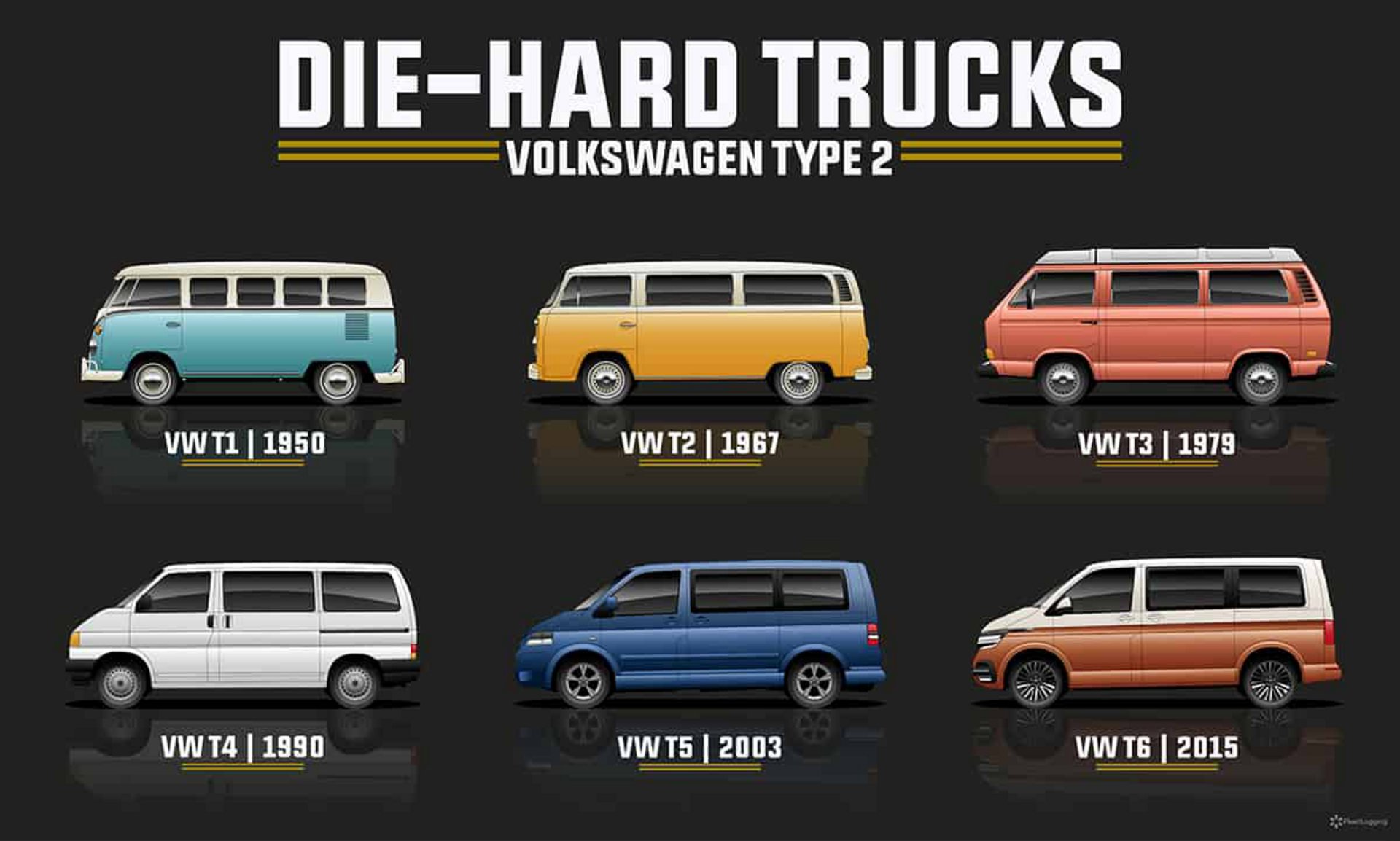Κατά καιρούς έχει κατασκευαστεί σε εκδόσεις minivan, minibus, pick-up και campervan, καλύπτοντας αρκετά διαφορετικές ανάγκες και απαιτήσεις. Έτσι, στις μέρες μας λογίζεται ως το πιο καλοπουλημένο van στην ιστορία των μετακινήσεων, με περισσότερα από 12 εκ. αντίτυπα να έχουν περάσει από τη γραμμή παραγωγής του. Εκμεταλλευόμενοι τα όμορφα σκίτσα της Fleet Logging, επιχειρούμε μία μικρή ιστορική αναδρομή.
