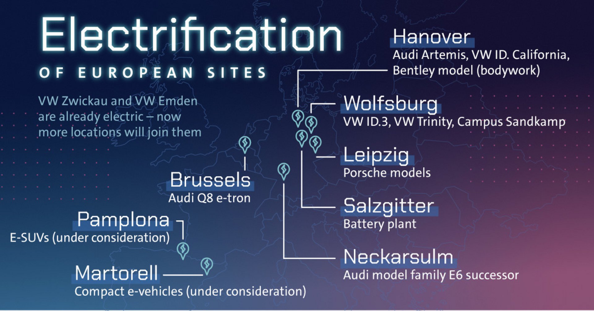 Στην Ιβηρική Χερσόνησο, το VW Group σχεδιάζει την κατασκευή συμπαγών ηλεκτρικών οχημάτων στο εργοστάσιο του Martorell και ηλεκτρικών SUV στην Παμπλόνα από το 2025.