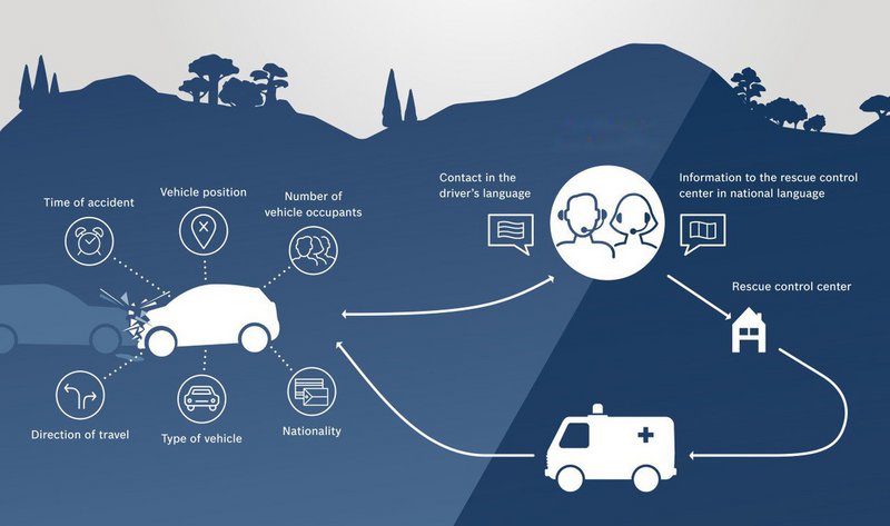 Το e-call καλεί αυτόματα το 112, τον πανευρωπαϊκό αριθμό κλήσης έκτακτης ανάγκης, σε περίπτωση ατυχήματος, ενώ μπορεί να ενεργοποιηθεί και χειροκίνητα με το πάτημα του κατάλληλου μπουτόν στο εσωτερικό του αυτοκινήτου. Με την κλήση παρέχει στις υπηρεσίες διάσωσης την ακριβή θέση του οχήματος, το χρόνο του συμβάντος και την κατεύθυνση κίνησης του αυτοκινήτου -το τελευταίο είναι ιδιαίτερα σημαντικό στις εθνικές οδούς.