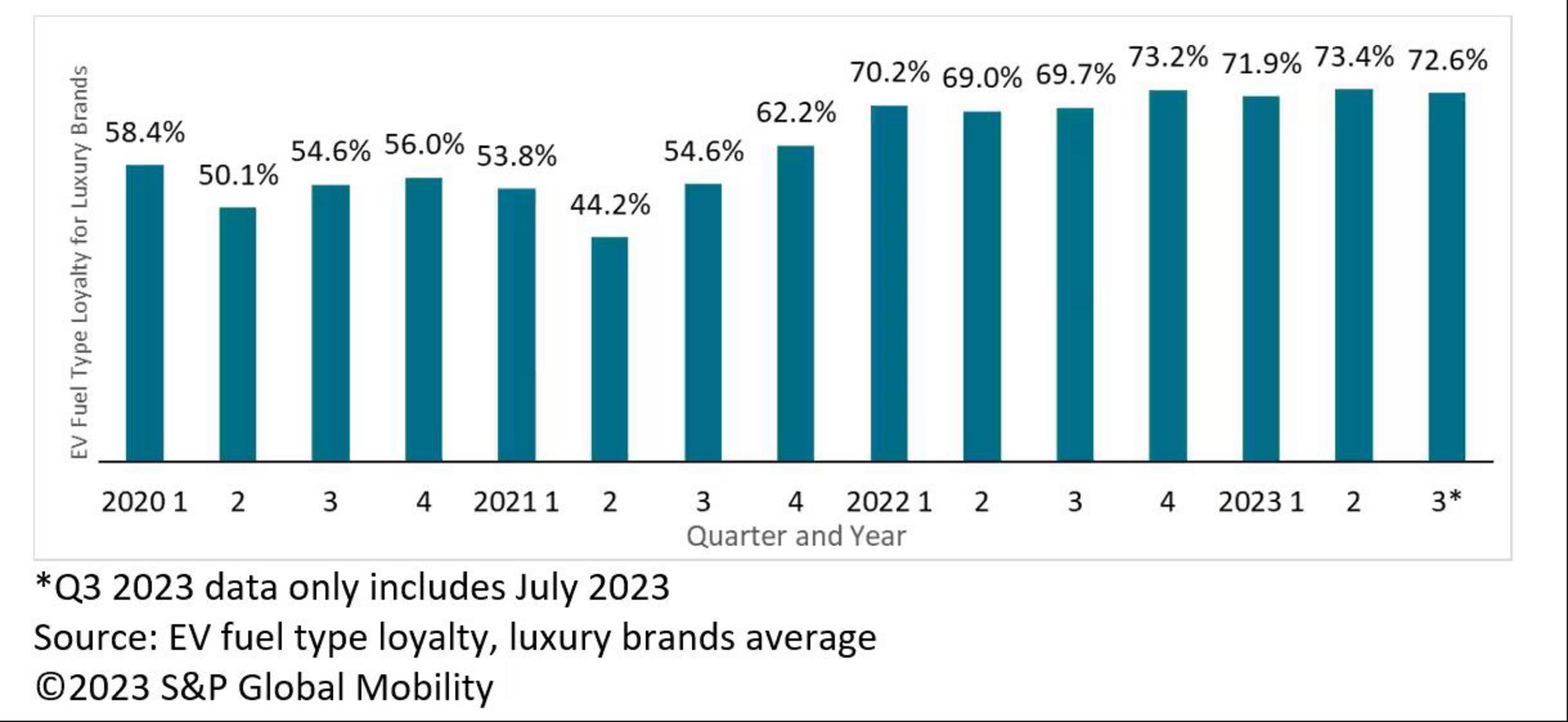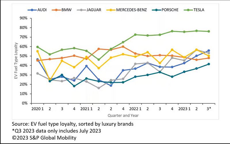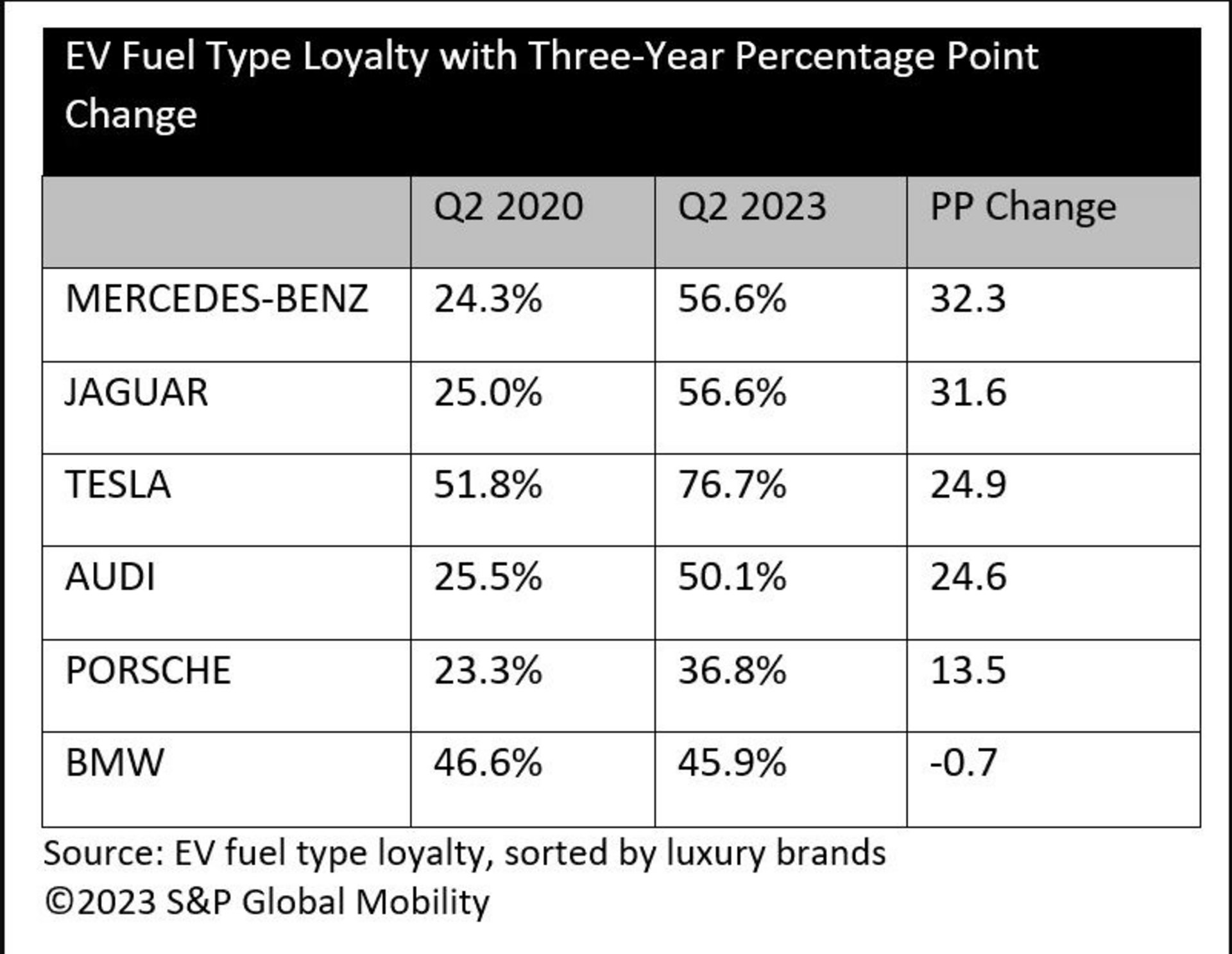 Εκτός από την Tesla, αρκετές άλλες πολυτελείς μάρκες βελτίωσαν το ποσοστό πιστότητας των πελατών τους σε EV με τα στοιχεία που υπάρχουν ως το 2ο τρίμηνο του 2023. Για παράδειγμα, το 56,6% των κατόχων ηλεκτρικών αυτοκινήτων της Mercedes επιλέγουν EV για το επόμενο όχημα, ποσοστό αυξημένο κατά 32,3% σε σχέση με το αντίστοιχο του πρώτου εξαμήνου του 2020 (24,3%). Αντίστοιχη άνοδο παρουσιάζεται και στους κατόχους EV της Jaguar (56,6% από 25%), της Audi (50,1% από 25,5%) και Porsche (36,8% από 23,3%). Στην κορυφή είναι οι κάτοχοι Tesla με 76,7% (από 51,8%). Αντίθετα, το ποσοστό πιστότητας σε EV από τους κατόχους ηλεκτρικών BMW μειώθηκε σε 45,9% από 46,6%.