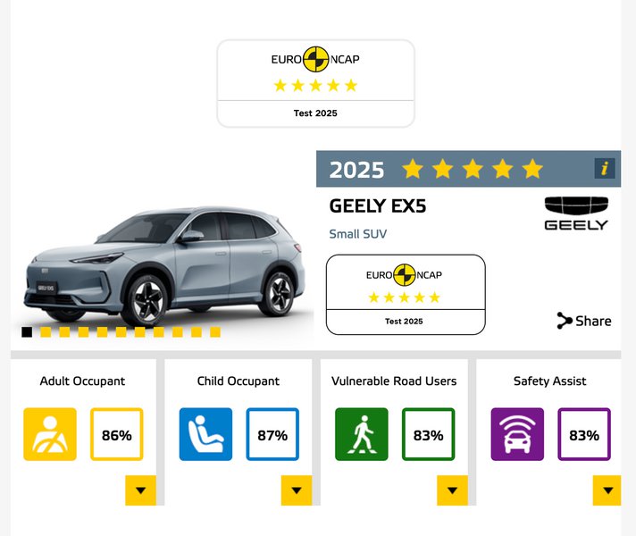 ειδικούς του κλάδου. Το νέο αμιγώς ηλεκτρικό SUV, Geely EX5, απέσπασε την ανώτατη βαθμολογία 5 αστέρων τόσο στις δοκιμές ασφάλειας του Euro NCAP(Ευρωπαϊκό Πρόγραμμα Αξιολόγησης Νέων Αυτοκινήτων) όσο και του ANCAP (Αυστραλιανό και Νεοζηλανδικό Πρόγραμμα Αξιολόγησης Οχημάτων).