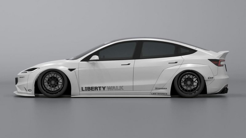 Εκτός αυτού, η Liberty Walk έχει προσφέρει στο ηλεκτρικό sedan ένα μεγάλο μπροστινό spoiler, μια πίσω αεροτομή, ενώ υπάρχει κι ένας νέος διαχύτης στο πίσω μέρος. Στα πλαϊνά, βρίσκει κανείς νέες ποδιές κι όλα τα πρόσθετα είναι κατασκευασμένα από πλαστικό που έχει ενισχυθεί με ανθρακόνημα.