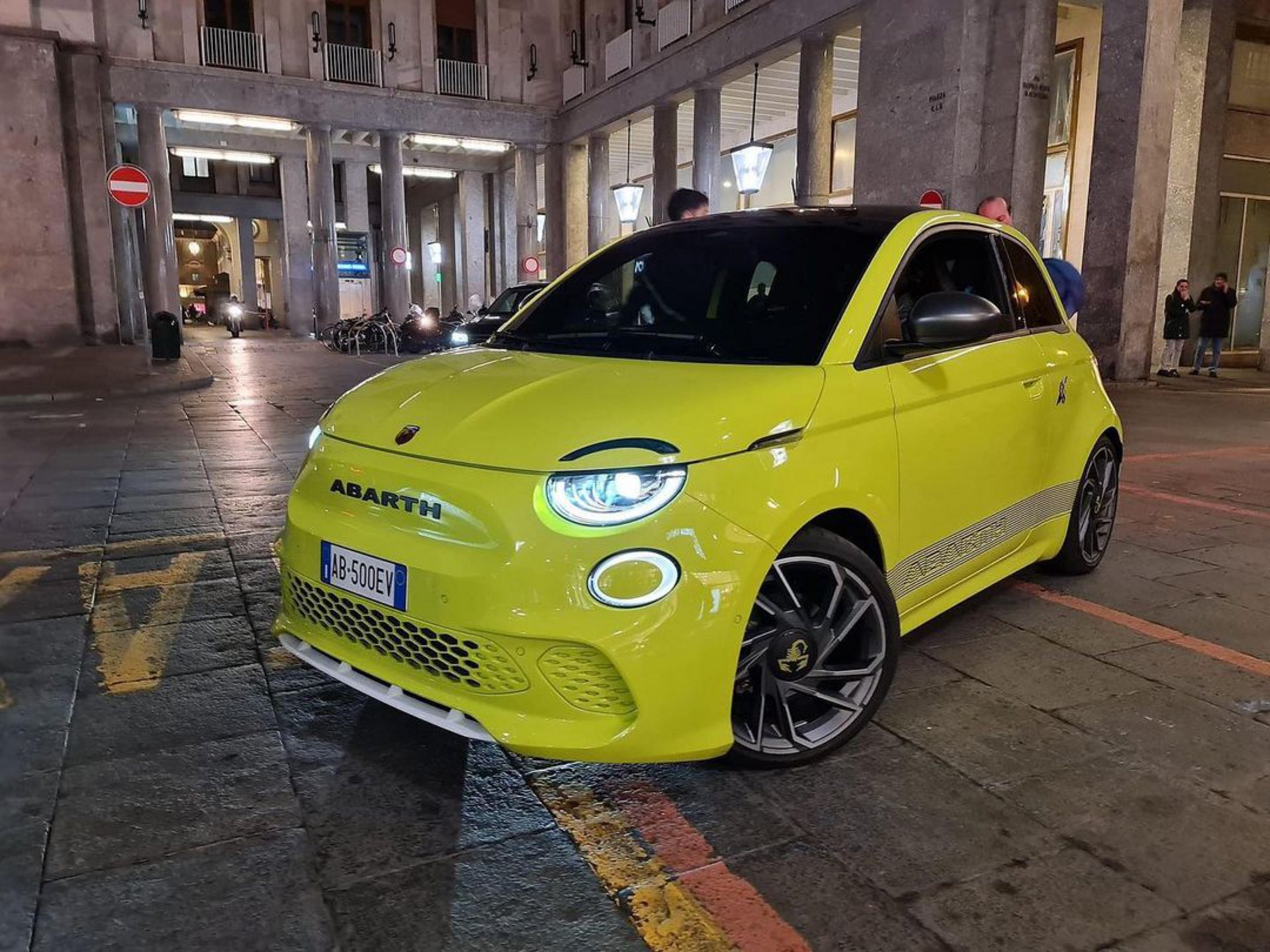Όπως μπορείτε να δείτε το Abarth 500e που πόζαρε στη φωτογράφηση είχε κίτρινο φωσφοριζέ χρωματισμό, που δένει εξαιρετικά με τους μαύρους καθρέφτες και τις λευκές λεπτομέρειες, κάνοντάς το να ξεχωρίζει.