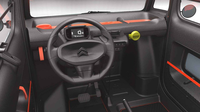 Ο γάντζος της τσάντας είναι, πλέον, κίτρινος, «συνδέοντας» με αυτό τον τρόπο το εξωτερικό με το εσωτερικό, στο οποίο κυριαρχεί η πορτοκαλί απόχρωση των τριών αποθηκευτικών κουτιών και των ραφών στα ταπέτα. Τέλος, τη δική τους συμβολή στις χρωματικές αντιθέσεις παρέχουν οι λευκές επενδύσεις στους τροχούς.
