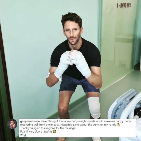 «Ποτέ δεν είχα σκεφτεί ότι μερικά βαθιά καθίσματα θα με έκαναν τόσο χαρούμενο! Το σώμα ανακάμπτει καλά, έπειτα από την πρόσκρουση. Ευελπιστώ το ίδιο να γίνει και με τα εγκαύματα στα χέρια. Σας ευχαριστώ και πάλι για τα μηνύματά σας. Υ.Γ.: Εξακολουθώ να είμαι πολύ αργό στο να γράφω μηνύματα!» έγραψε στα social media ο Grosjean.