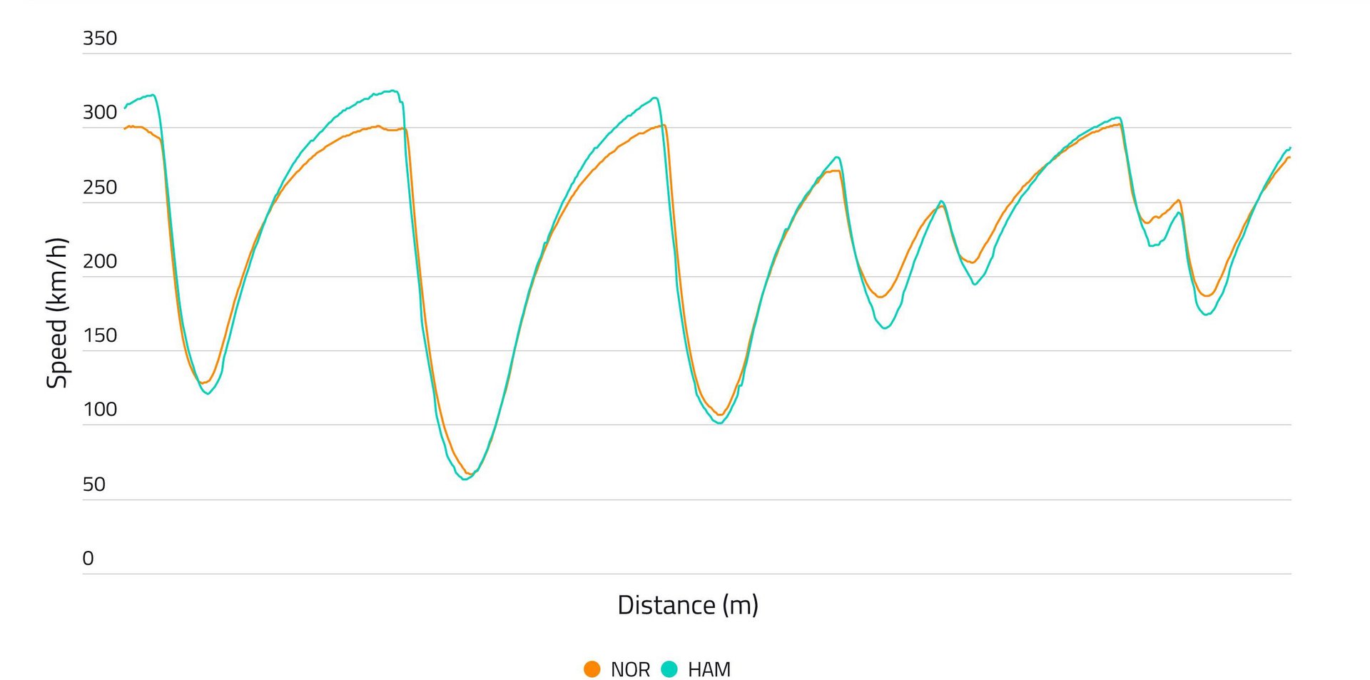 Η πρόκληση ήταν μεγάλη, ειδικά από τη στιγμή που ο Hamilton πίεζε όσο περισσότερο μπορούσε για να διατηρήσει τη διαφορά των 5’’. Οι μετρήσεις στις ευθείες έδειξαν πως ο Hamilton εκινείτο με σχεδόν 20 χιλιόμετρα μεγαλύτερη ταχύτητα σε σύγκριση με τον Norris.