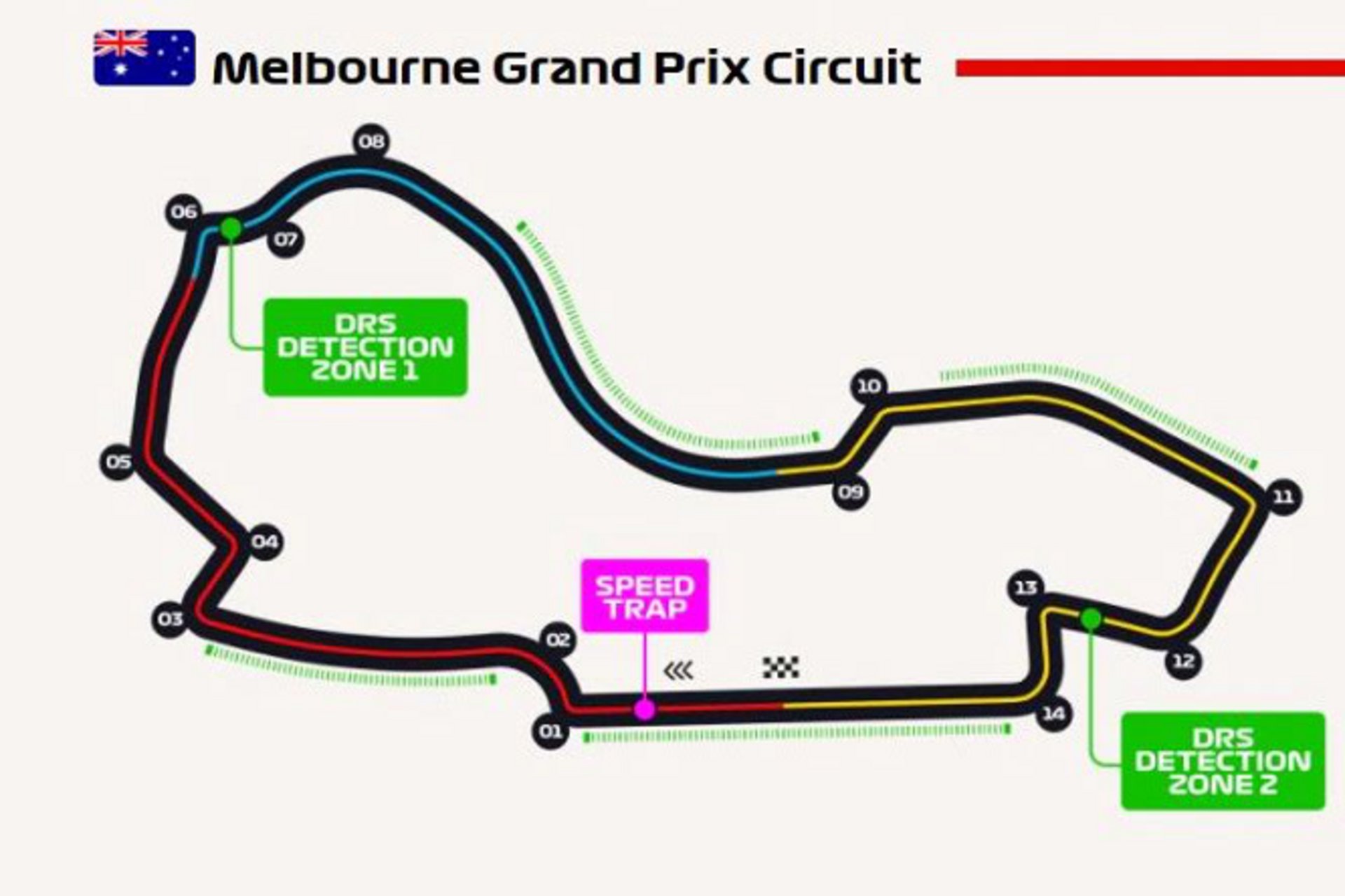 Εκτός από τις τρεις "παραδοσιακές" ζώνες DRS, οι οποίες υπήρχαν ήδη στην πίστα την τελευταία φορά που διεξήχθη το GP Αυστραλίας, ήτοι κατά μήκος της ευθείας των πιτς, στην προέκταση που οδηγεί στη στροφή 3 και στο τμήμα που ενώνει τις στροφές 10 και 11, θα προστεθεί και μια τέταρτη ζώνη στη νέα ευθεία που οδηγεί στο γρήγορο σικέιν των στροφών 9 και 10.