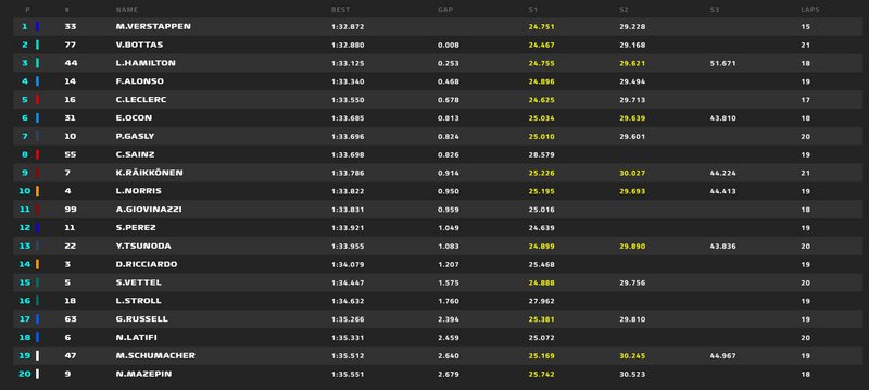 Σε αυτό το πλαίσιο, ο Max Verstappen κατάφερε να γράψει τον ταχύτερο χρόνο, για μόλις 0,008 δλ. από τον Valtteri Bottas, που συνέχισε να υπερτερεί (πειστικά) έναντι του teammate του, LewisHamilton.