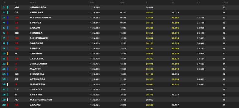 Δυνατή η εικόνα του Esteban Ocon σε ρυθμό αγώνα, με την 5η θέση του, ενώ την απόλυτη έκπληξη έκανε ο Robert Kubica στην 6η θέση, μπροστά από τον ομόσταβλό του στην Alfa Romeo, Antonio Giovinazzi.