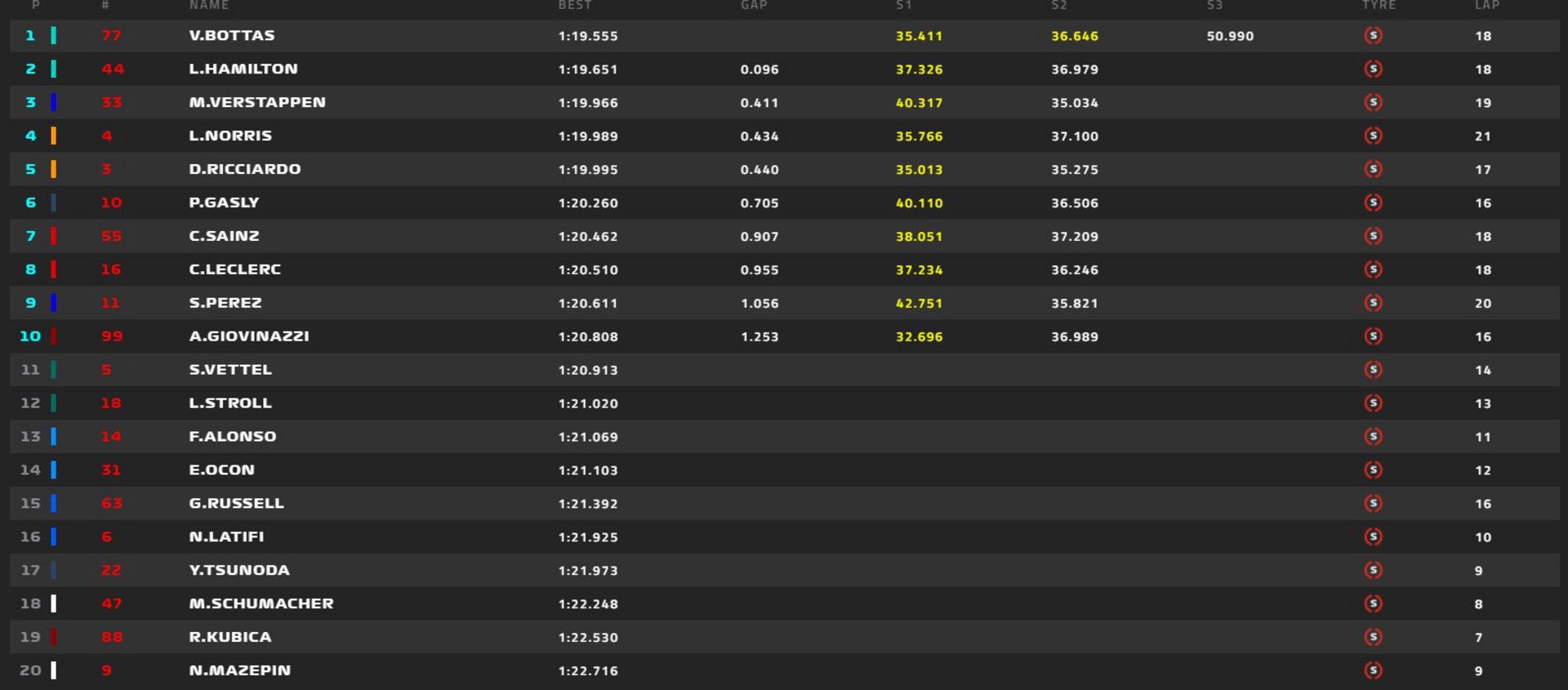 Hamilton και Bottas ήταν οι ταχύτεροι σε αυτήν την πρώτη φάση, με τον Norris 3o, τρία δέκατα πίσω και τον Verstappen 4o, μισό δευτερόλεπτο πίσω.