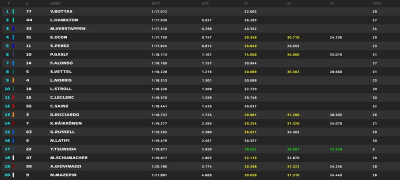 Έκπληξη ήταν η 4η θέση που κατέλαβε ο Esteban Ocon για λογαριασμό της Alpine, μπροστά από τον Sergio Perez, που βελτίωσε την εικόνα του σε σχέση με το πρωί.