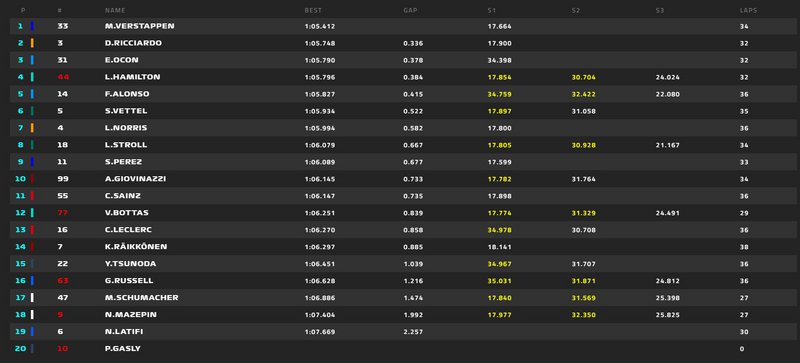 Αντιθέτως, δεύτερος ήταν ο Daniel Ricciardo για τη McLaren, με διαφορά 0,3 δευτερολέπτων, που με τη σειρά είχε οριακά πίσω του τον Esteban Ocon της Alpine.