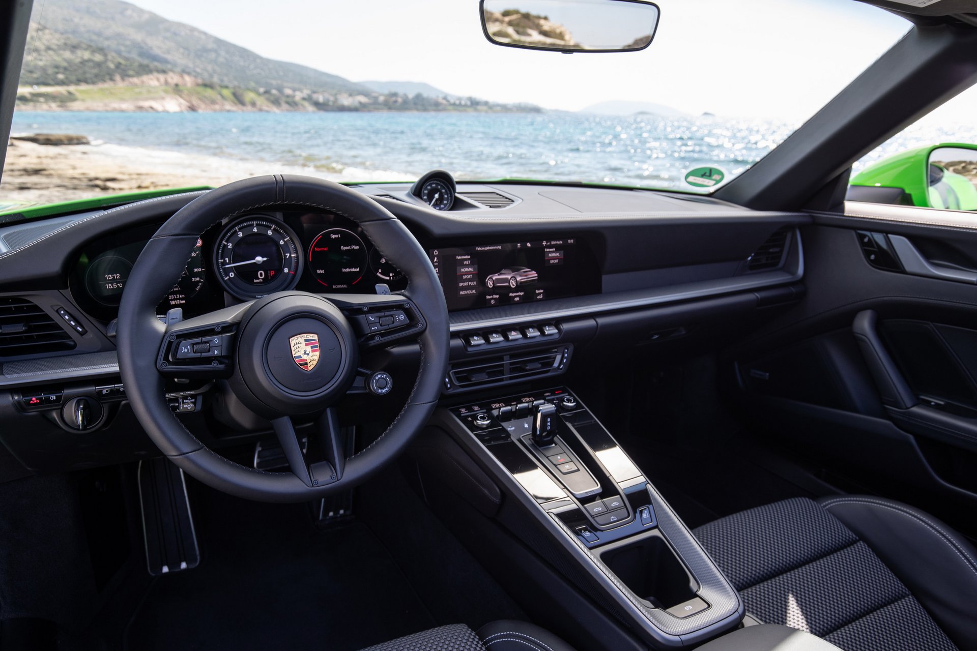 Το αυτοκίνητο δοκιμής μας με κίνηση στους πίσω τροχούς ήταν προικισμένο με στάνταρ ηλεκτρική υποβοήθηση τιμονιού μεταβλητής σχέσης, βασισμένο στο σύστημα πέδησης torque vectoring, ηλεκτρονικά ελεγχόμενο διαφορικό περιορισμένης ολίσθησης με ενεργές αντιστρεπτικές, carbon δισκόπλακες και το πακέτο Sport που συνδυάζει ενεργά ρυθμιζόμενη εξάτμιση με μαύρες απολήξεις, πακέτο Sport Chrono και σπορ ανάρτηση. Πράγματα που έκαναν τούτη την ασκεπή 911 την πιο σπορ –τουλάχιστον για την ώρα- έκδοσή της. Εύκολα επίσης προσπερνάς τη γενική αίσθηση του πολύ large που αποκομίζεις από ένα τέτοιο αυτοκίνητο σε μικρές πόλεις ή πάρκινγκ και μας άφησε με βαθιά εκτίμηση για την απίστευτη πρόσφυση της.