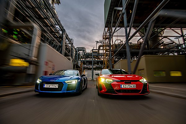 Μοιράζονται την ίδια γραμμή παραγωγής, αλλά το R8 Spyder ολοκληρώνει τον κύκλο ζωής του, τη στιγμή που το RS e-tron GT τώρα ξεκινάει. Το πριν και το μετά σε μια μοναδική συνάντηση.