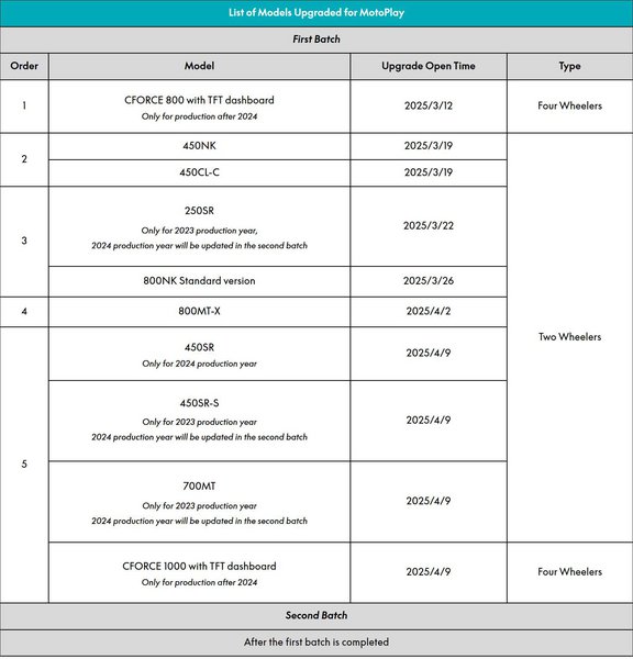 Σύμφωνα με τον προγραμματισμό που ανακοινώνει η CFMOTO, η όλη διαδικασία αναβάθμισης του πακέτου συνδεσιμότητας για τις μοτοσυκλέτες της θα έχει ολοκληρωθεί σε βάθος εξαμήνου.