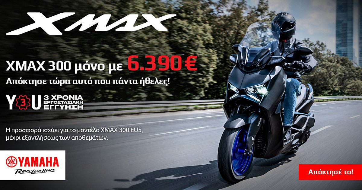 (*) Η ενέργεια αφορά το μοντέλο XMAX 300 EU5 και για περιορισμένο αριθμό οχημάτων, μέχρι εξαντλήσεως των αποθεμάτων.