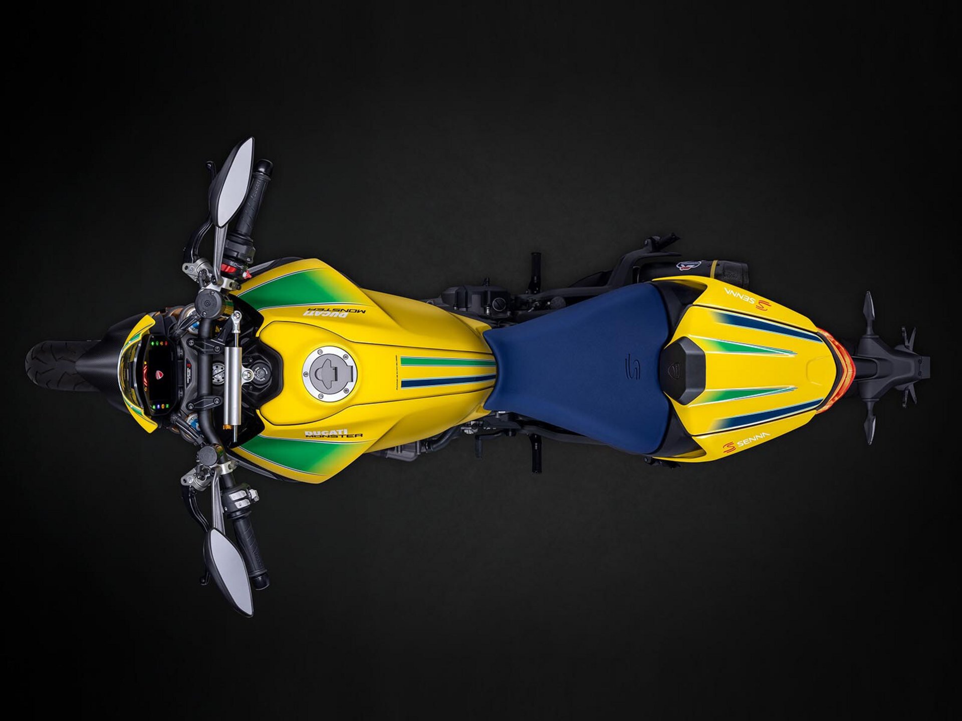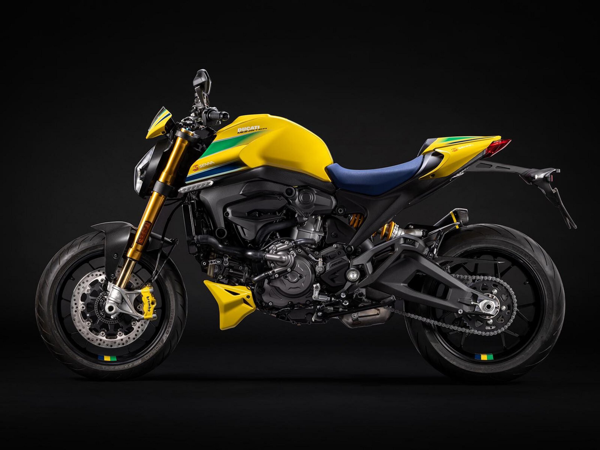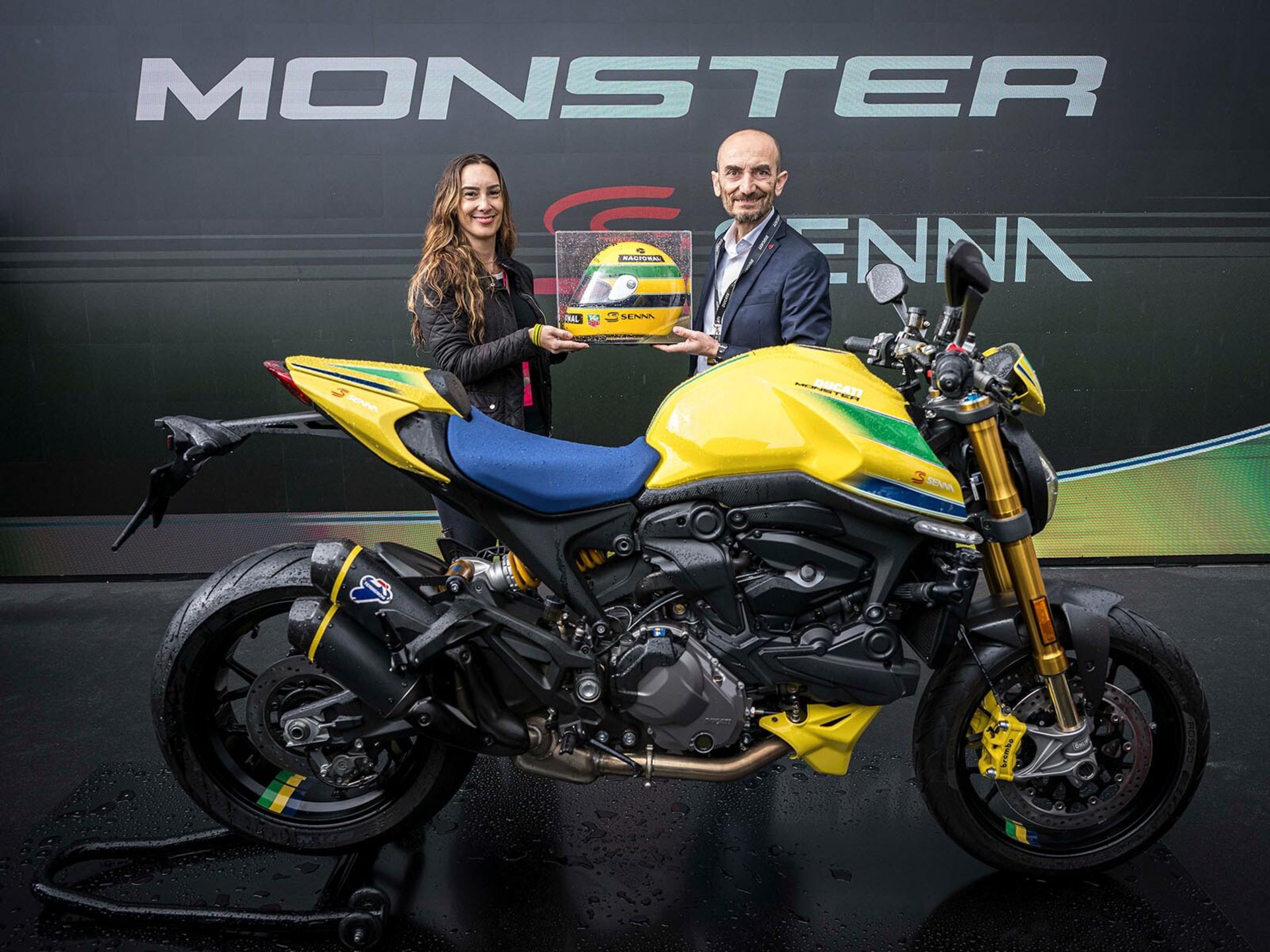 Το Monster Senna αποτίει φόρο τιμής στο ταλέντο του τρεις φορές Παγκόσμιου Πρωταθλητή με ένα ιδιαίτερο χρώμα που είναι εμπνευσμένο από το χρώμα του κράνους που φορούσε ο Ayrton σε αγώνες σε όλη την καριέρα του με μέρη σε κίτρινο, πράσινο και μπλε, καθαρές αναφορές στη σημαία της Βραζιλίας. Η παρουσίαση της μοτοσυκλέτας που αφιέρωσε η Ducati στον Senna πραγματοποιήθηκε στο paddock της πίστας Enzo and Dino Ferrari στην Imola με αφορμή το εκεί Grand Prix της Formula 1. Η ανάμνηση του δεσμού μεταξύ Senna και Ducati μεταφέρθηκε μέσα από τα λόγια των Claudio Domenicali, Bianca Senna με τη συμβολή και του Stefano Domenicali.