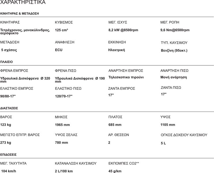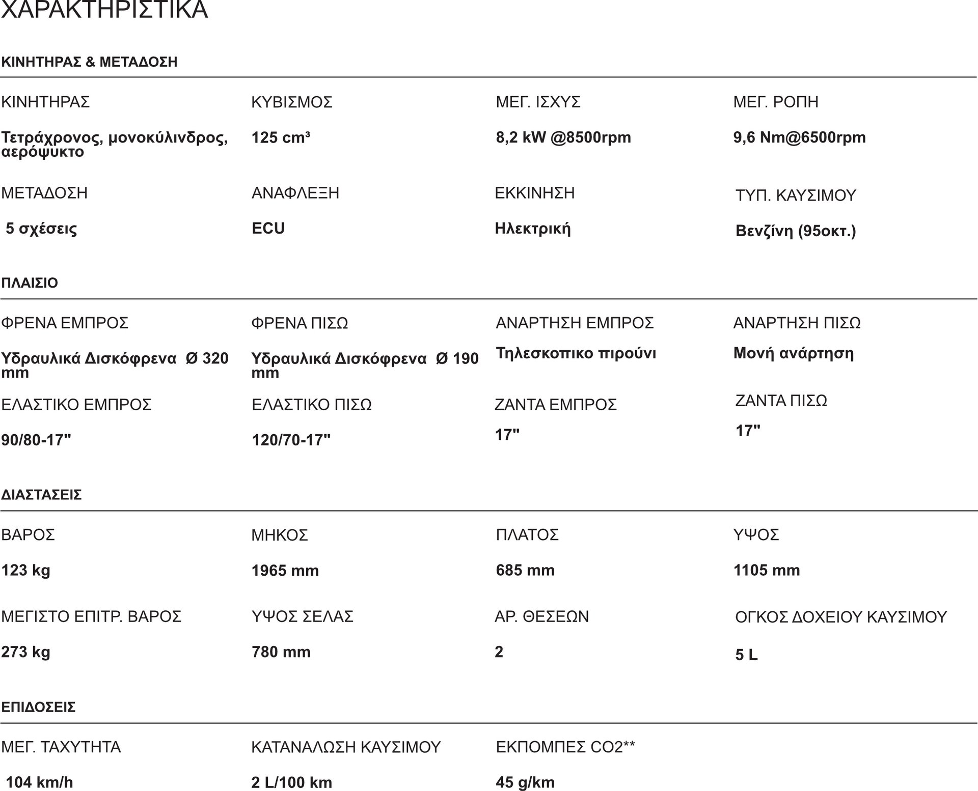 Το Malaguti Spectre GP 125 πληροί τις προδιαγραφές Εuro 5, διαθέτοντας ισχυρό κινητήρα 125 cc με σύστημα τροφοδοσίας καυσίμου EFI, σύστημα συνδυασμένης πέδησης (CBS), 5 ταχύτητες με συμπλέκτη, μοντέρνο σχεδιασμό και αιχμηρή εμφάνιση με σύγχρονες λεπτομέρειες, full LED φωτισμό, USB θύρα, ψηφιακή οθόνη και αναλογικό στροφόμετρο, δισκόφρενα εμπρός 320mm και πίσω 190mm τύπου μαργαρίτα, ζάντες αλουμινίου 17΄΄ με tubeless ελαστικά και Monoshock πίσω ανάρτηση.