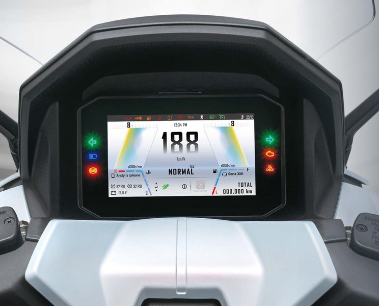 Η πολυτέλεια που αποπνέει η νέα πρόταση της SYM αντανακλάται σε στοιχεία όπως η μεγάλη έγχρωμη οθόνη TFT με διαγώνιο 7 ιντσών και στάνταρ συνδεσιμότητα Bluetooth που περιλαμβάνει και ενσωματωμένη υποστήριξη Apple CarPlay, αλλά και στο cruise control που επίσης ανήκει στον στάνταρ εξοπλισμό, ενώ για κερασάκι προσθέτουμε και το Cornering Assist Headlight System, δηλαδή φώτα που στρέφονται για να φωτίζουν στο εσωτερικό της στροφής
