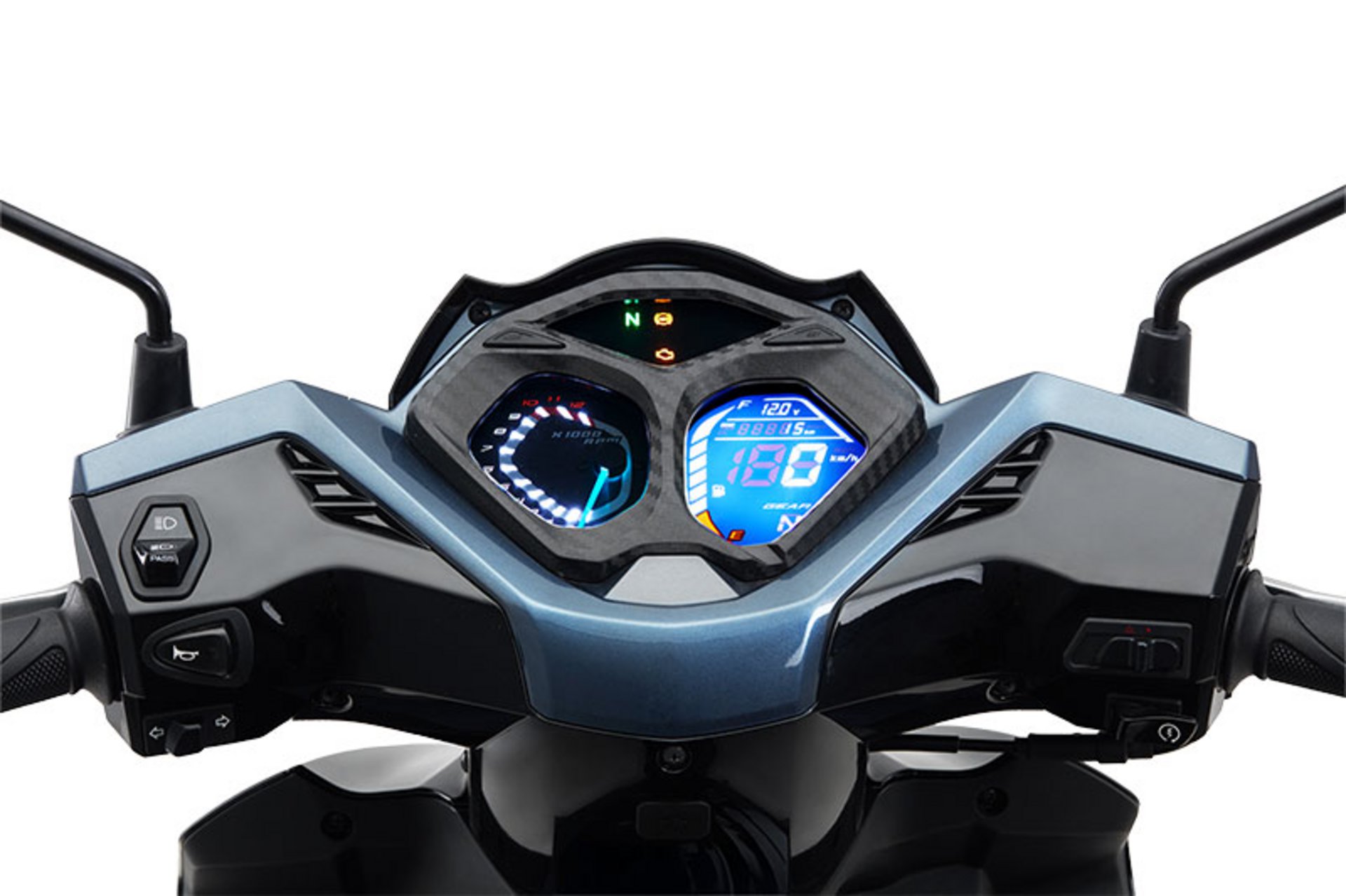 Το SYM VF185 εντυπωσιάζει με τον sport & aggressive σχεδιασμό του. Οι αιχμηρές γραμμές και η μοντέρνα αισθητική αναδεικνύουν τον δυναμικό του χαρακτήρα, κάνοντάς το να ξεχωρίζει στον δρόμο.