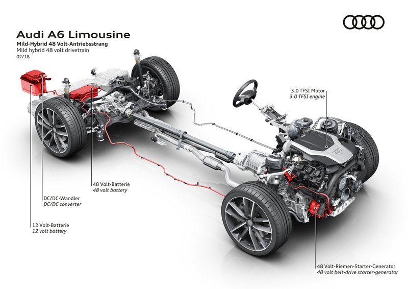 Σε ότι αφορά τη γκάμα των κινητήρων, που θα ξεκινούν από τα 2.000 cc τόσο για βενζίνη όσο και diesel, όλα τα σύνολα θα διαθέτουν την ήπια υβριδική υποβοήθηση της Audi, στην οποία ένα ηλεκτροκινητήρας στη μίζα (RSG) συνδυάζεται με μπαταρίες ιόντων λιθίου. Παράλληλα το νέο Audi A6 μπορεί μεταξύ των 55 και των 160 km/h να ρολάρει, η λειτουργία Start Stop μπορεί να ενεργοποιείται από την ταχύτητα των 22 km/ h, ενώ υπάρχει και ανάκτηση ενέργειας έως 12 kW κατά το φρενάρισμα. Το αποτέλεσμα όλων των παραπάνω είναι η μείωση της κατανάλωσης κατά 0,7 lt ανά 100 km.