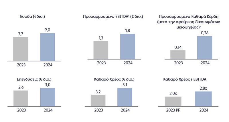 Τα προσαρμοσμένα καθαρά κέρδη διαμορφώθηκαν σε €426 εκατ. έναντι €206 εκατ. το 2023 . Τα προσαρμοσμένα καθαρά κέρδη μετά την αφαίρεση των δικαιωμάτων μειοψηφίας διαμορφώθηκαν σε €365 εκατ. από €140 εκατ. το 20232.
