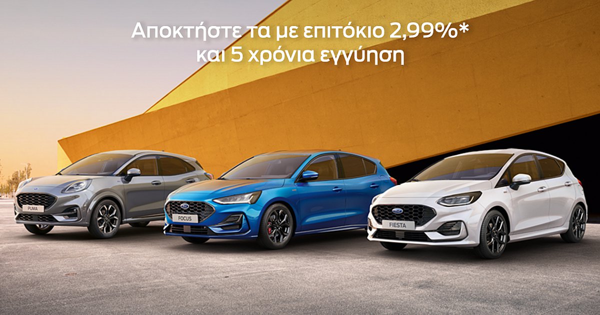 Τα νέα προγράμματα χρηματοδότησης της Ford Finance με το χαμηλότερο επιτόκιο της αγοράς 2,99% για τα μοντέλα της Ford, προσφέρουν στους πελάτες που επιθυμούν να αποκτήσουν εύκολα το νέο τους αυτοκίνητο σημαντικό όφελος συγκριτικά με τα επιτόκια των χρηματοδοτικών προγραμμάτων της αγοράς*, και πιο συγκεκριμένα: