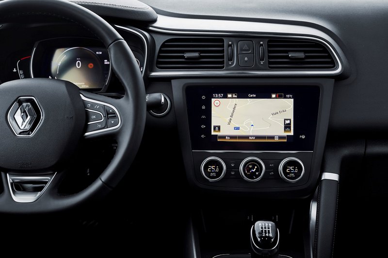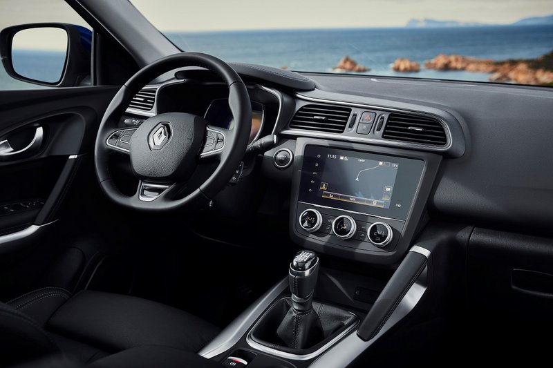 Στο εσωτερικό, οι αλλαγές, επίσης, είναι στοχευμένες στο να δίνουν μια περισσότερο πολυτελή αίσθηση στους επιβάτες. Τα υλικά που έχουν χρησιμοποιηθεί είναι καλύτερα οπτικά αλλά και στην αφή, σε σχέση με πριν. Καίρια αλλαγή είναι η τοποθέτηση στην κονσόλα νέας, έγχρωμης οθόνης αφής διαγωνίου 7,0 in, στην οποία απεικονίζονται οι ενδείξεις από το σύστημα ενημερωδιασκέδασης «R-Link 2». Αυτό παρέχει τη δυνατότητα σύνδεσης smartphone μέσω «Android Auto« αλλά και «Apple CarPlay». Εκτός αυτών, επανασχεδιασμένοι είναι και οι διακόπτες για τη λειτουργία του κλιματισμού ενώ Kadjar διατίθεται με καλύτερης ποιότητας ταπετσαρίες.