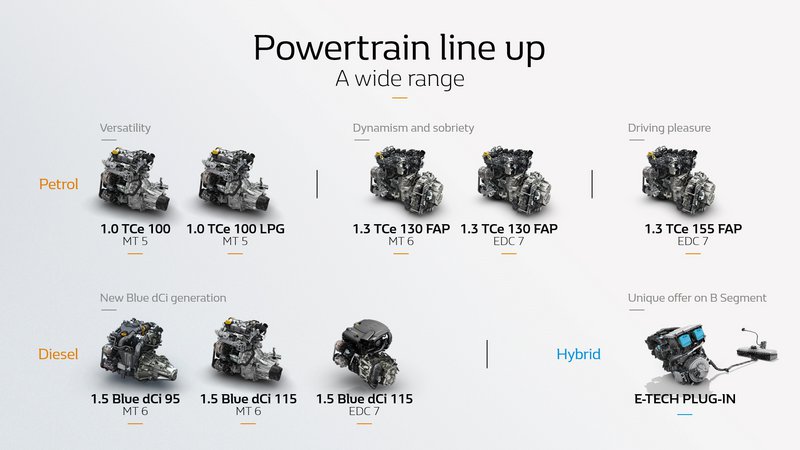 Σε ό,τι αφορά το diesel θα προσφέρεται το σύνολο Blue dCi 95 (240 Nm) με 6άρι μηχανικό κιβώτιο και το Blue dCi 115 (260 Nm) με 6άρι μηχανικό ή διπλού συμπλέκτη 7άρι κιβώτιο ταχυτήτων. Και βέβαια το ηλεκτρικό μέλλον ακούει στο όνομα E-TECH Plug-in με έναν βενζινοκινητήρα 1,6 λίτρου, δύο ηλεκτροκινητήρες, μπαταρία 9,8 kWh και δύο τύπους φορτιστή. Το σύνολο ενσωματώνει 150 πατέντες και υπόσχεται αμιγή ηλεκτρική λειτουργία για μέχρι 45 χιλιόμετρα απόσταση με ταχύτητα μέχρι 135 km/h.