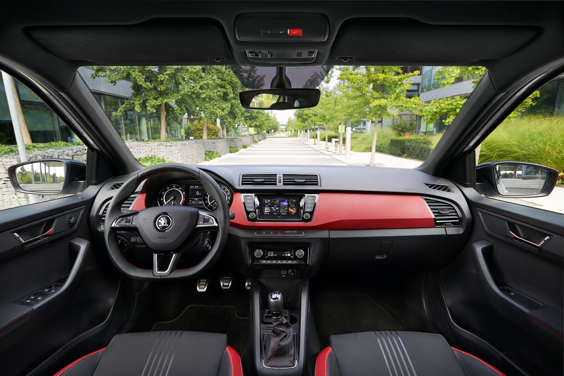 Το εσωτερικό συνδυάζει λειτουργικότητα με αναβαθμισμένη ποιότητα. Νέες επενδύσεις καθισμάτων, κόκκινες ραφές, σπορ πολυλειτουργικό τιμόνι, πεντάλ σε σχεδίαση αλουμινίου, σπορ σασί, επιλογή δυο διακοσμητικών επενδύσεων για το ταμπλό, μαύρο εσωτερικό και πάνελ θυρών με κόκκινες ραφές στα υποβραχιόνια είναι μερικές μόνο από τις νέες επιλογές. Τα όργανα στο ταμπλό είναι επίσης ανανεωμένα, ενώ εργονομικά το αυτοκίνητο είναι καλύτερο. Παρά τις συμπαγείς διαστάσεις της με μήκος 3.997 mm και μεταξόνιο 2.470 mm, η Skoda Fabia προσφέρει ευρυχωρία για έως πέντε άτομα.