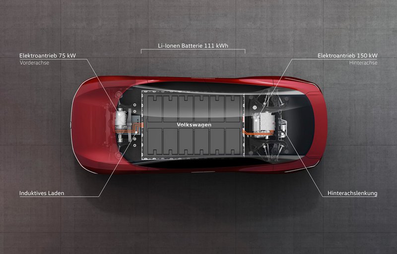 Όπως προαναφέραμε το VW I.D. Vizzion είναι πλήρως ηλεκτρικό, με δύο ηλεκτροκινητήρες. Έναν 75 kW στον εμπρός άξονα, έναν 150 kW στον πίσω, που έχουν συνδυαστική ισχύ 225 kW και τροφοδοτούνται από μια μπαταρία 111 kW που είναι τοποθετημένη στο δάπεδο (η βάση είναι το πλαίσιο MEB). Η θεωρητική αυτονομία είναι 665 km, η τιμή για το 0-100 km/h είναι 6,3 sec και η τελική ταχύτητα θα περιορίζεται στα 180 km/h.