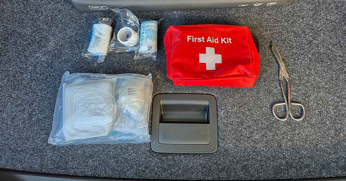 Πλέον, στο φαρμακείο του αυτοκινήτου πρέπει να υπάρχουν:ισοθερμική κουβέρτα διάσωσης, λευκοπλάστης, τσιρότα, ατομικοί επίδεσμοι διάφορων μεγεθών, επιθέματα εγκαυμάτων και πληγών, ελαστικοί επίδεσμοι στερέωσης, ψαλίδι πρώτων βοηθειών, ιατρικά γάντια μιας χρήσης, υγρά μαντηλάκια καθαρισμού δέρματος, ιατρική μάσκα προσώπου και οδηγίες πρώτων βοηθειών.